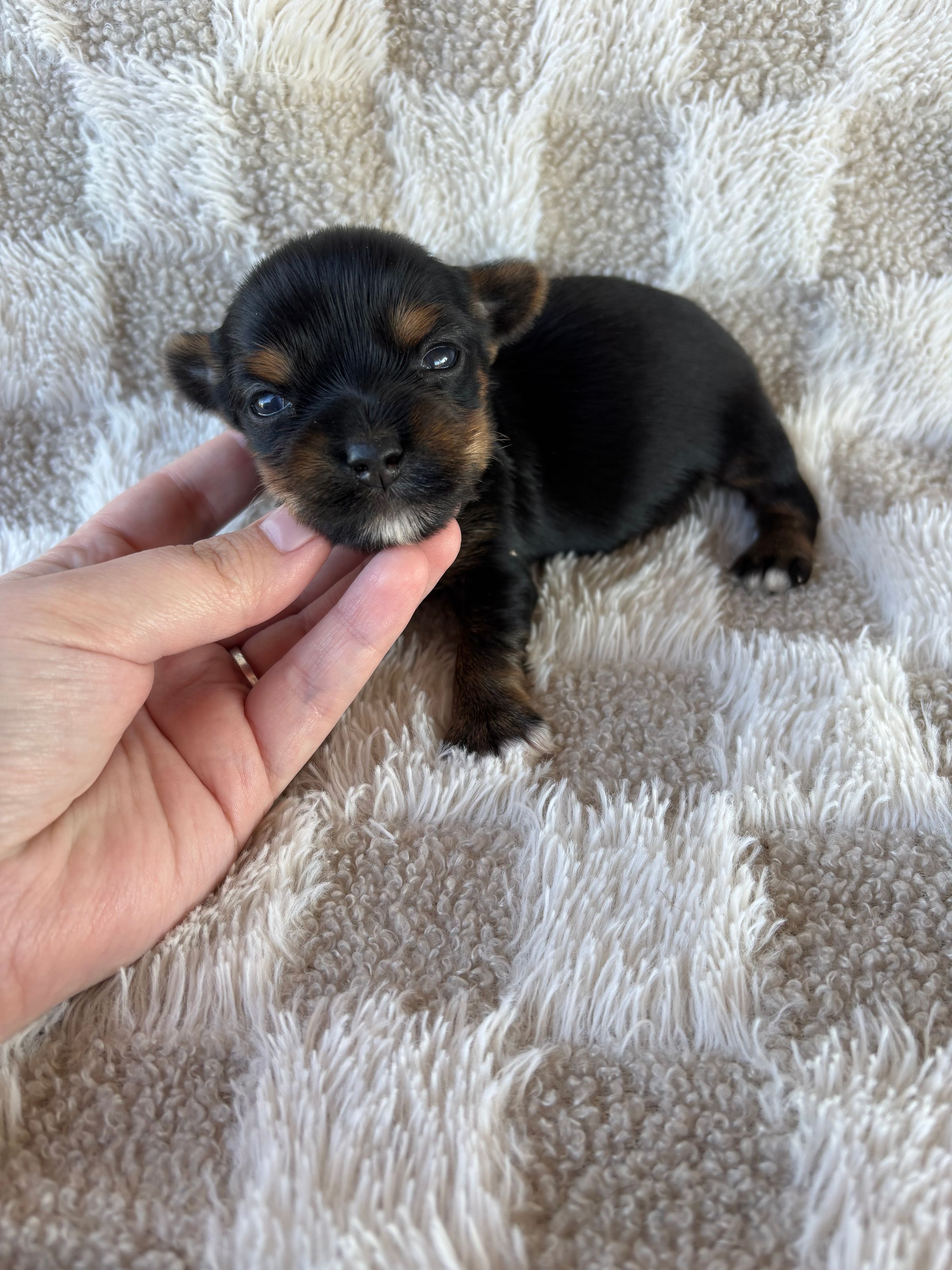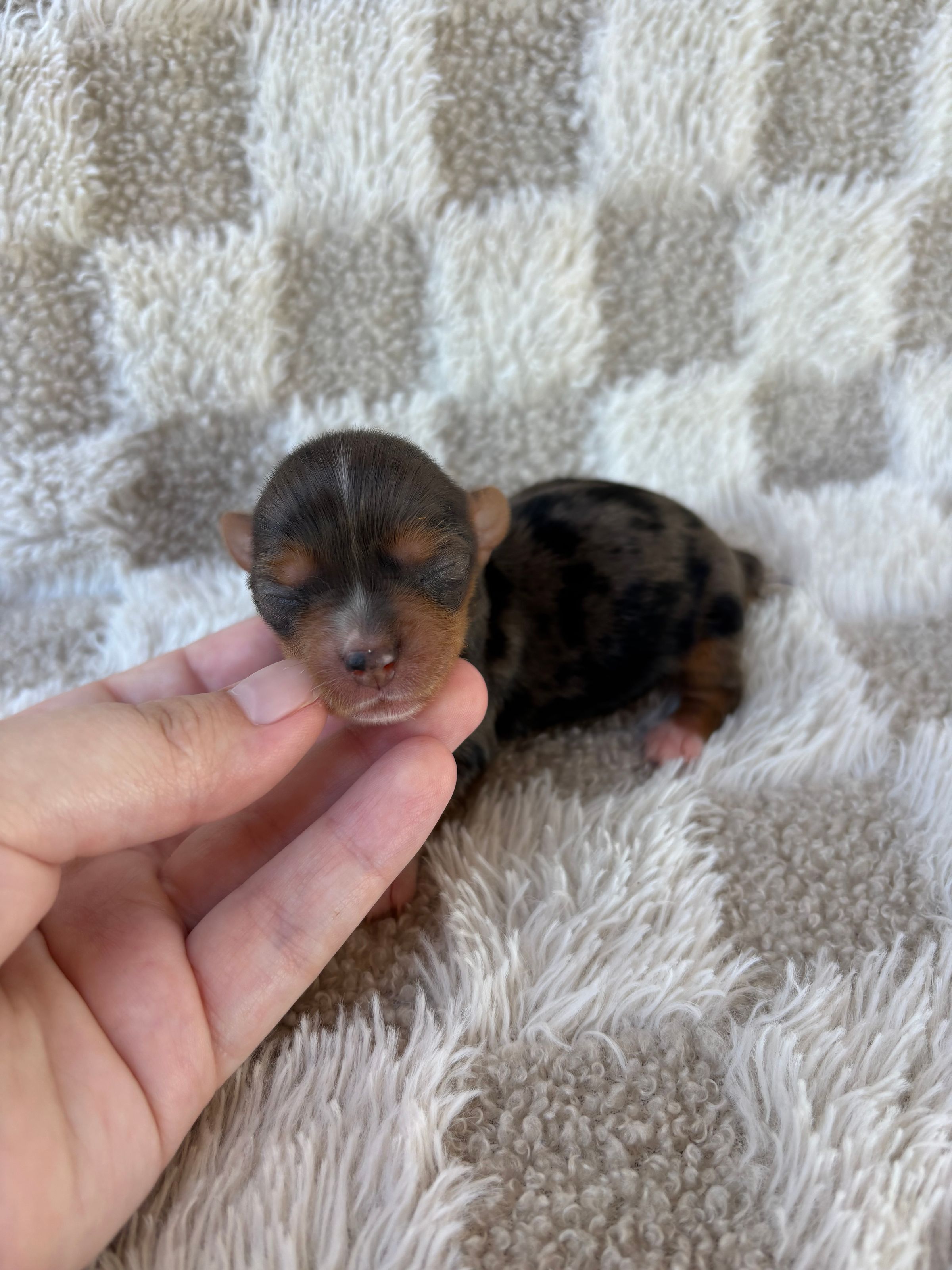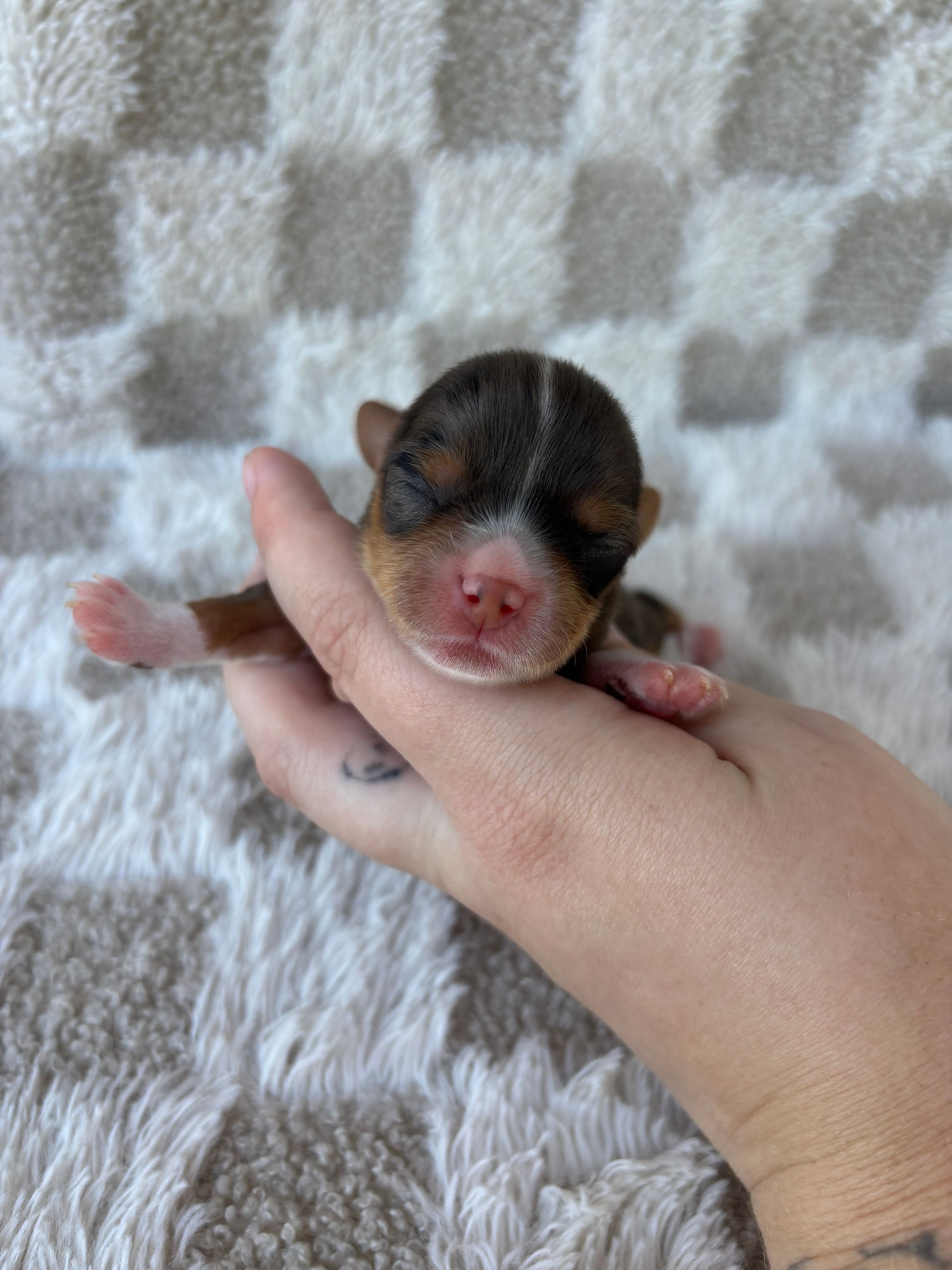 Meet Toby! He is a small little boy charting 5lbs full grown. His tail is docked and dew claws removed. He carries parti, chocolate and merle. He is APRI registered. He will come home with all of his vet records, registration paperwork and a going home bag.